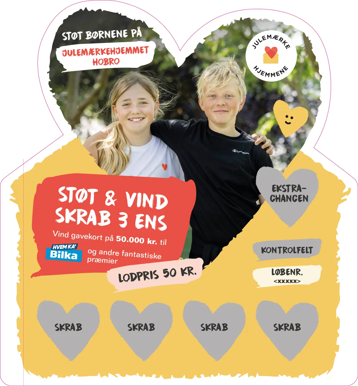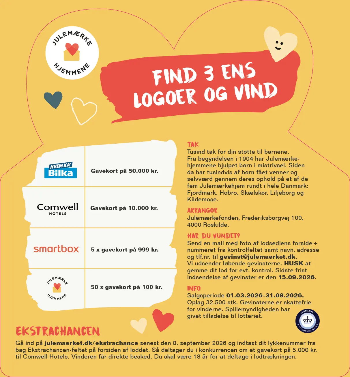 Overskuddet fra lotteriet går til Julemærkehjemmenes arbejde for det gode børneliv uden mobning, ensomhed og mistrivsel.
